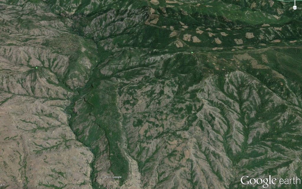 The historic Lassen Trail runs up the divide between Boat Gunwale Creek and Big Dry Creek. It is in the center of the image above, and has been used as a firebreak on many past large fires in this area. Most of this image is wilderness, and bulldozers are not usually allowed.