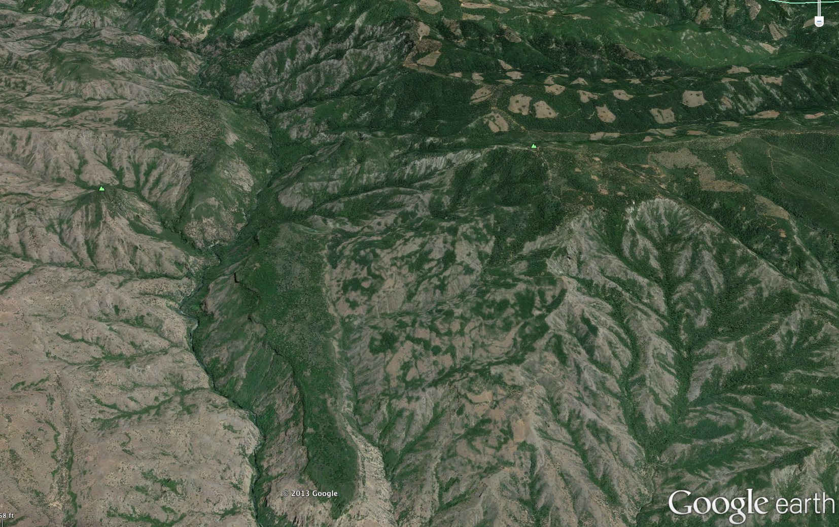Looking NE up Deer Creek, over the Ishi Caves area. Top end of Cohasset Ridge is on the center-right. Beaver Creek Pinery is in center of upper-left 1/4.