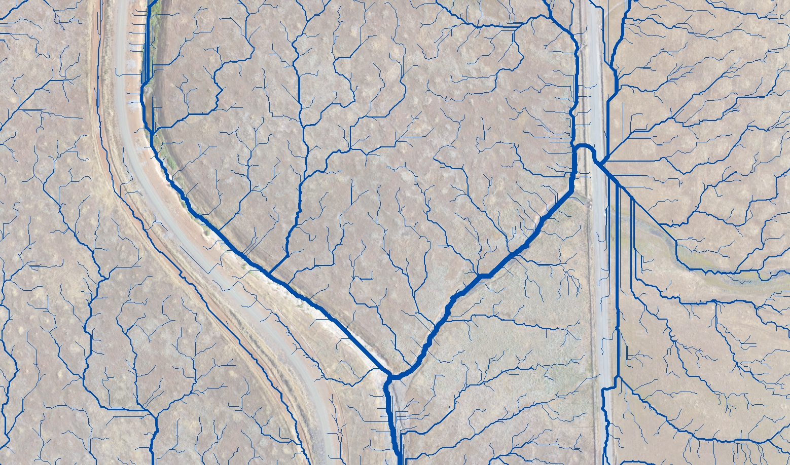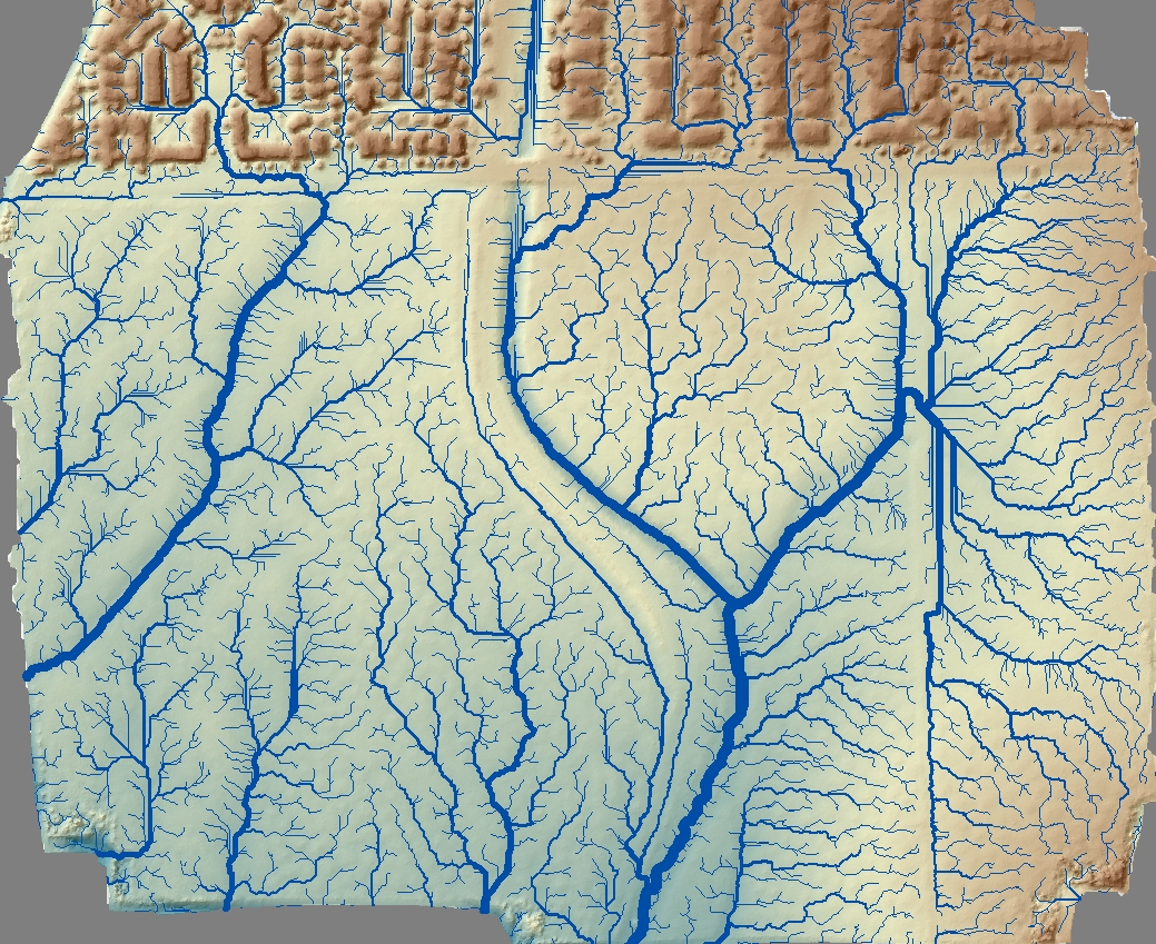 Orthophoto with flow modeling – flow details in paved urban area do not capture effects of storm-drains, but show surface flows.